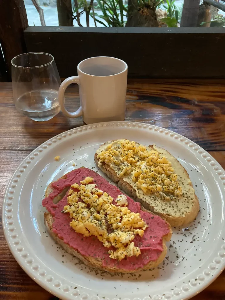 朝食です。5泊して、フムストーストばかり食べていました。