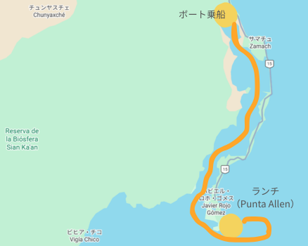 ボートでの移動経路は、ざっくりとこんな感じです。